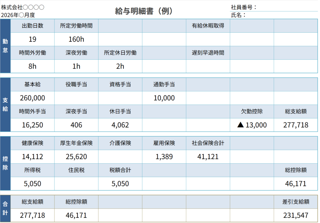 大前提として、給与明細の記載内容は、会社ごとに報酬体系・就業規則・フォーマットなどが異なります。