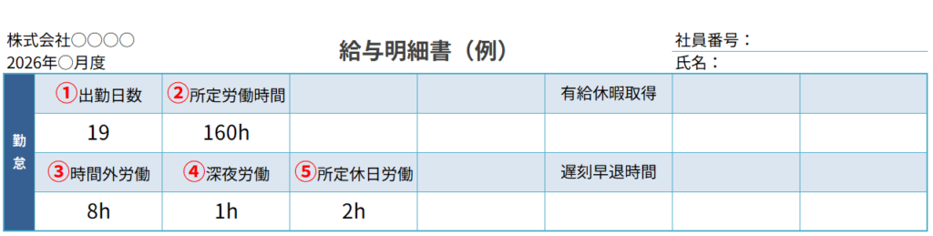 時間外労働や休日労働と重なる場合もあります。その場合、「時間外労働」や「休日労働」の時間と重複して記載されます。