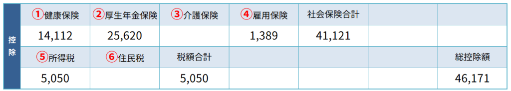 総支給額から差し引かれる社会保険料、税金の内訳が記載されています。